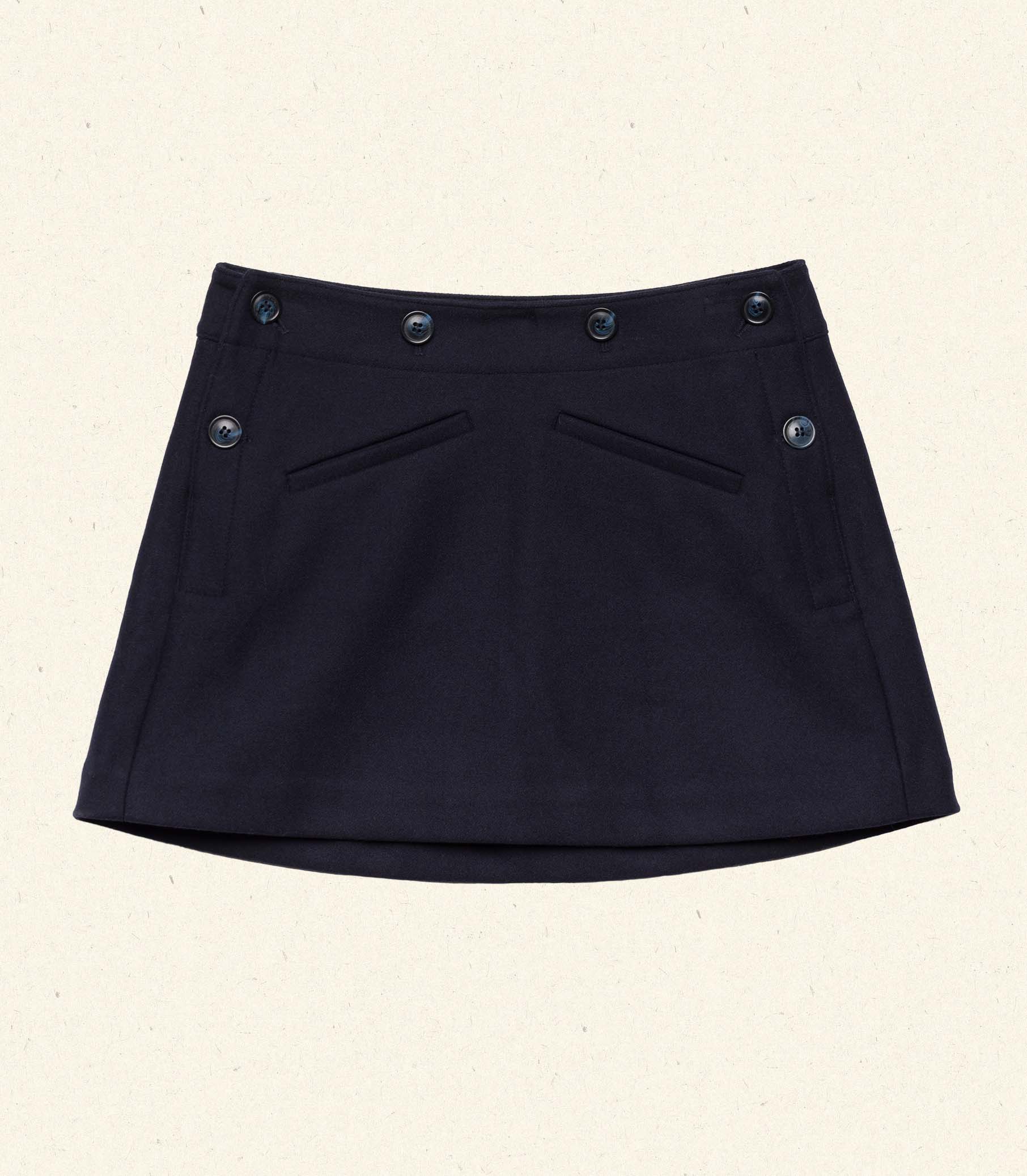 Crafted from an extra-warm wool blend, the Raina Skirt—a favorite of our co-founder, Katherine— takes cues from ‘60s nautical styles. Lined in soft viscose twill, it features an ultra-high waist, an A-line cut, and two welt pockets at the front. The waistband is adorned with two fixed buttons, plus four functional buttons at the sides.