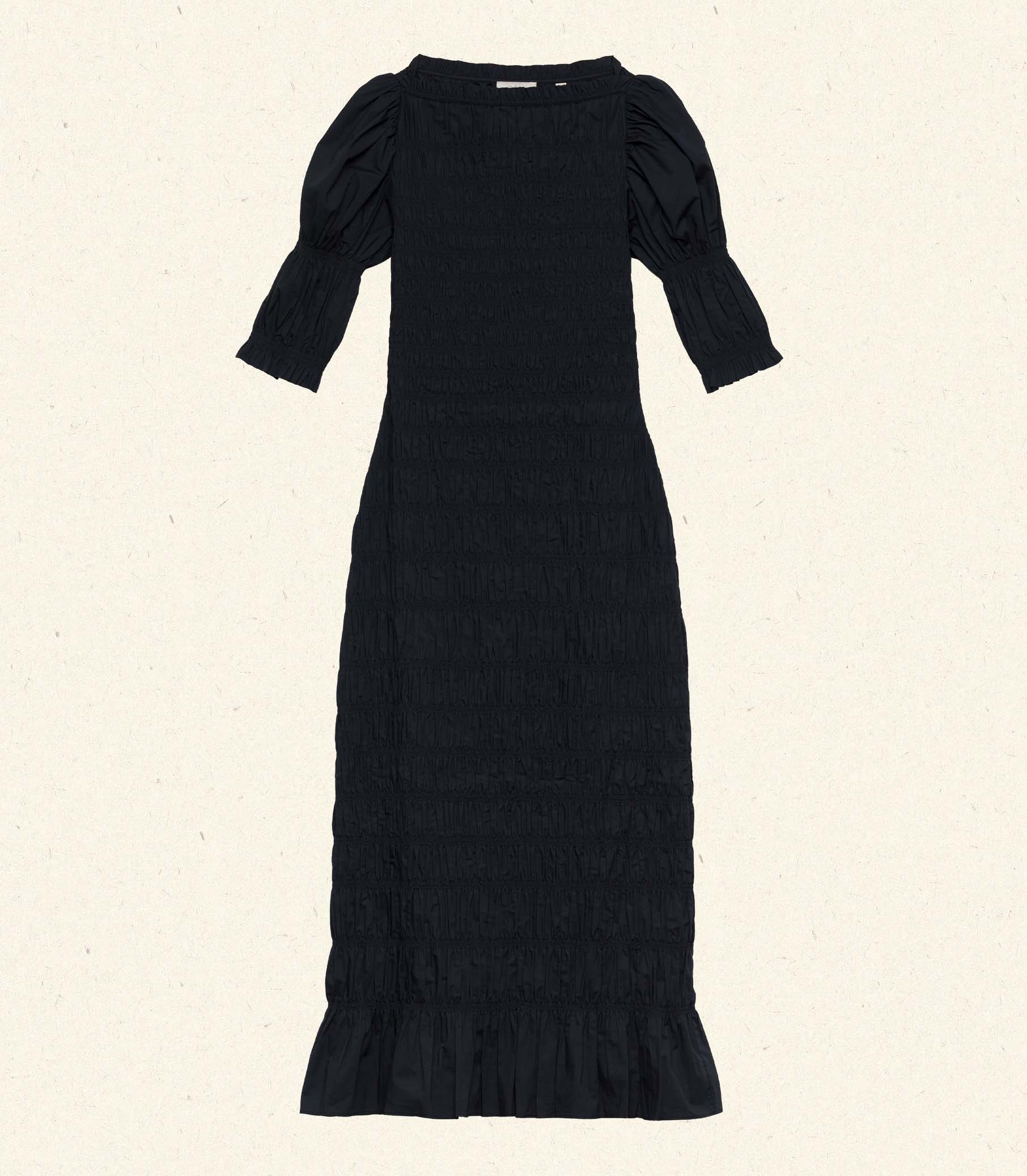 In a crisp organic cotton poplin, the Raquella Dress is an easy-wearing pullover style with a bateau neckline, elbow-length double-puffed sleeves, and allover elasticized smocking. A fitted silhouette gives way to an ankle-grazing skirt with a ruffle at the hem.