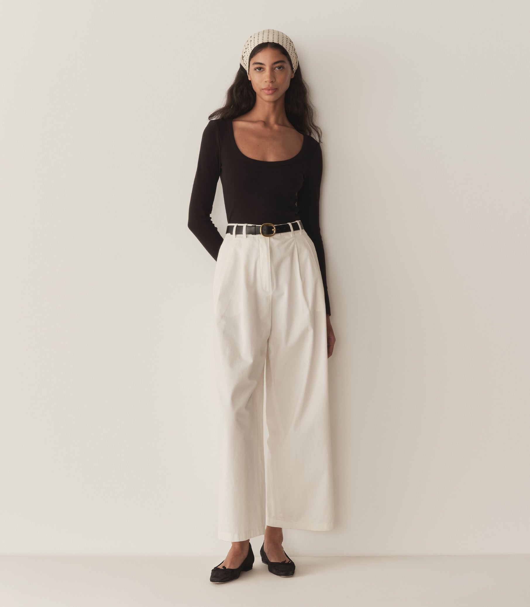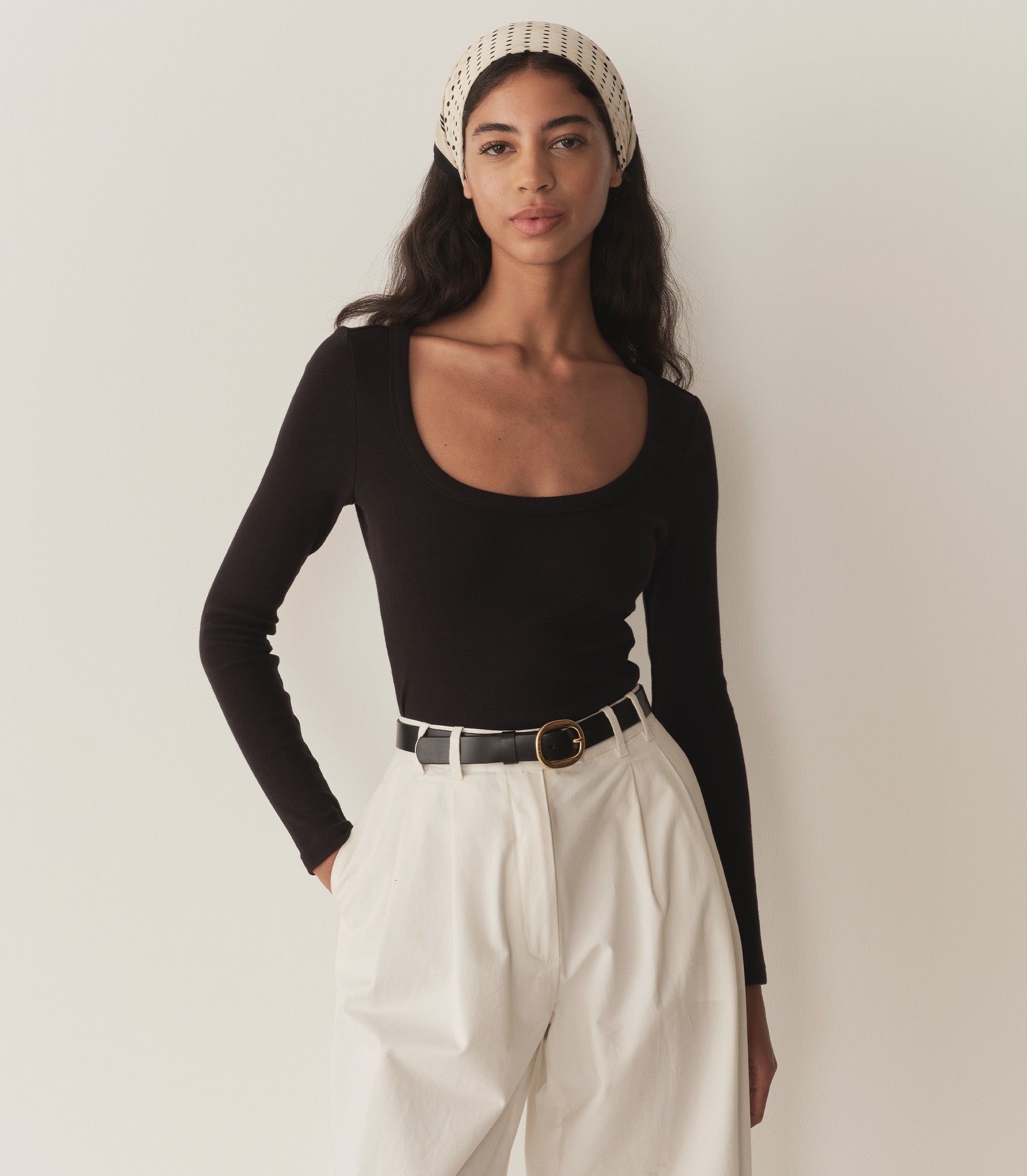 Crafted from a soft baby rib blend of regenerative and recycled cotton, the Romy Tee features fitted long sleeves and a bold scoop neck. Perfect for layering in the colder months, the Romy is sure to become a beloved year-round wardrobe staple.