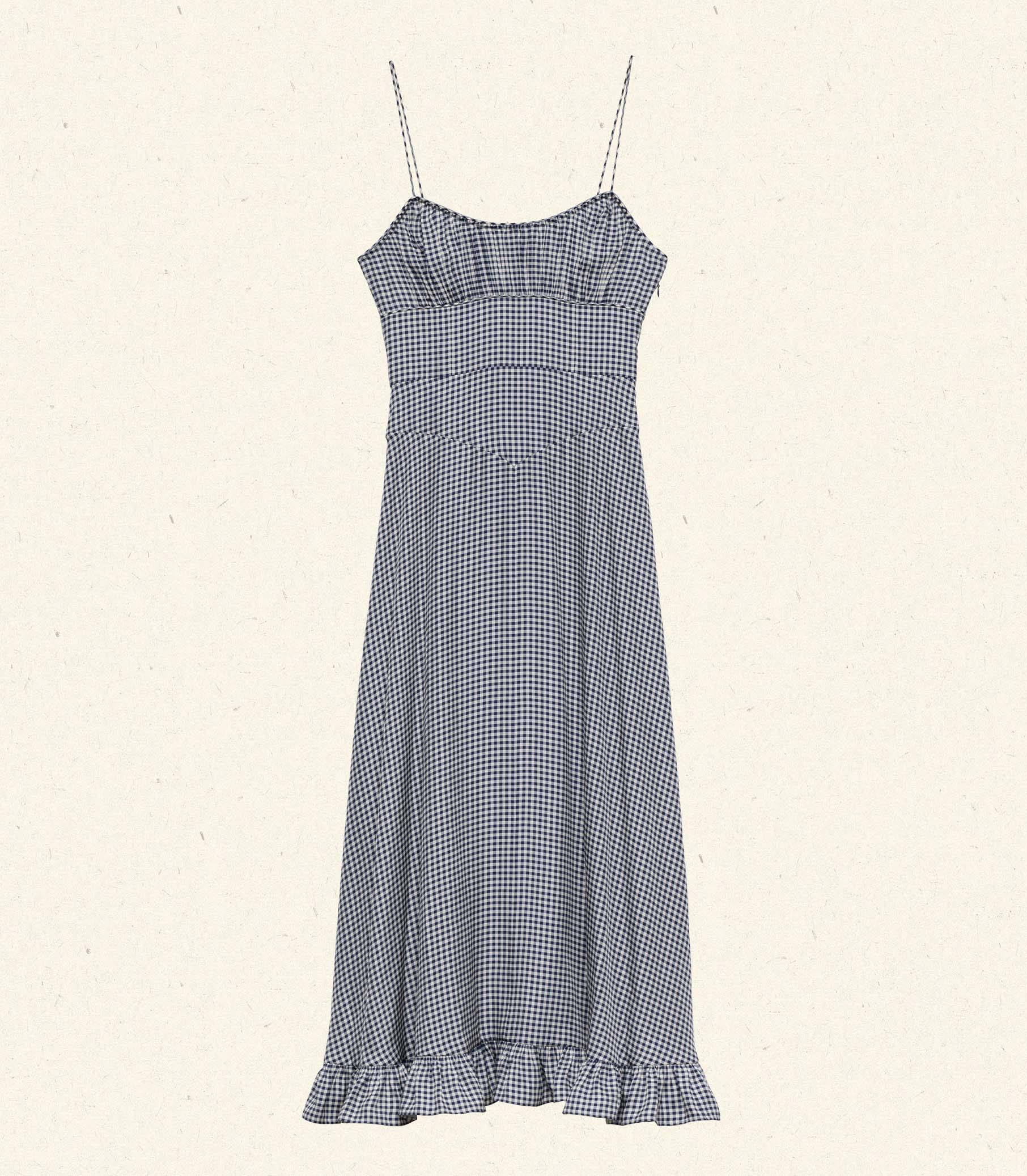 In a swingy silk-viscose twill and rendered in our nostalgic navy Santa Marina Gingham, the Rosaria Dress features a square neckline, ultra-skinny spaghetti straps, and a ruched bust. A fitted waist with an invisible side zipper gives way to an ankle-grazing A-line skirt with a ruffle trim.