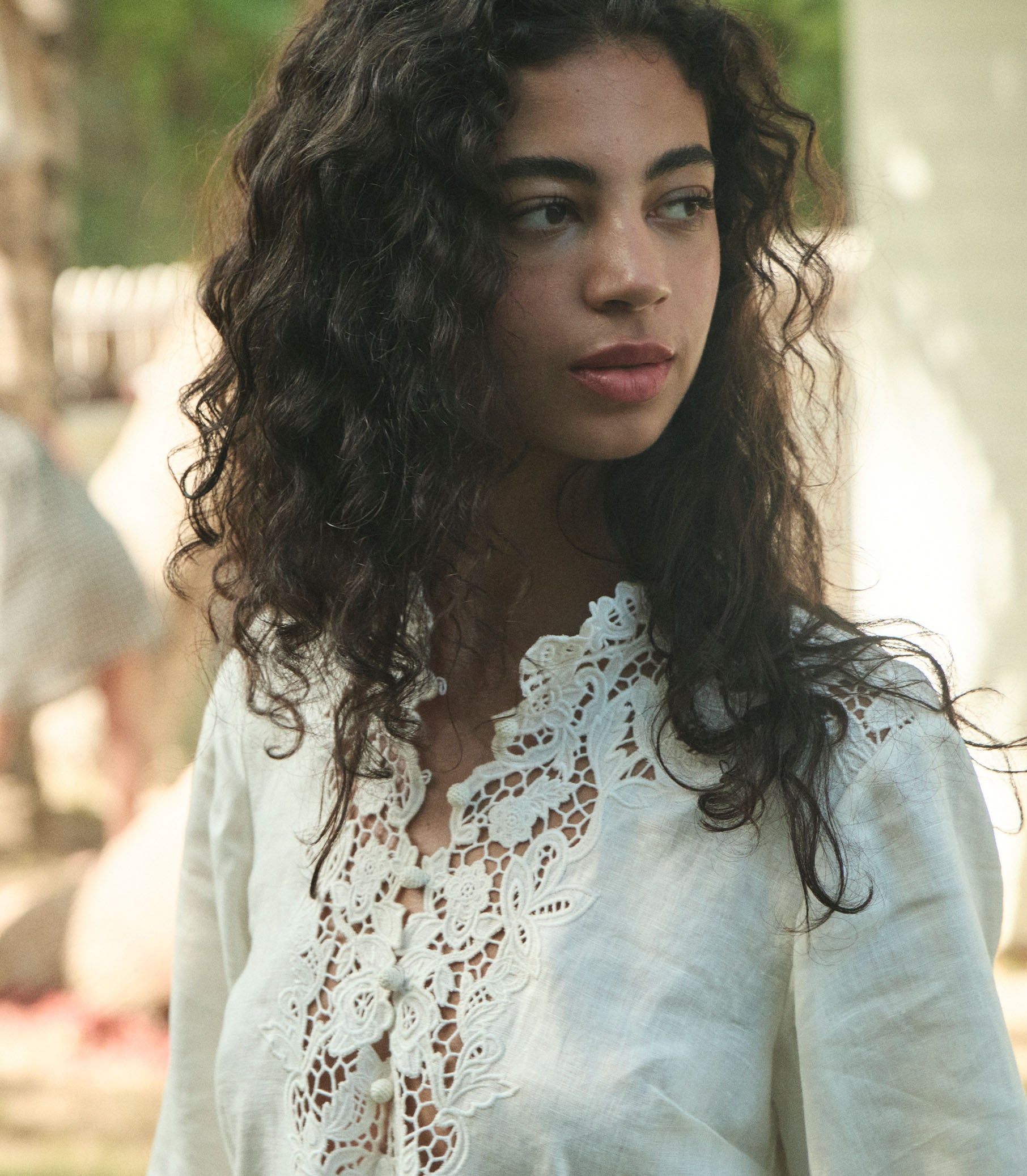 Crafted from crisp, lightweight linen, the ‘60s-inspired Rosélie Tunic features a high neck with a Nehru collar, three-quarter-length bell sleeves, and an A-line silhouette. Floral embroidery cutwork adorns the neckline, cuffs, and mini hemline, while hand-crocheted buttons extend down the front.