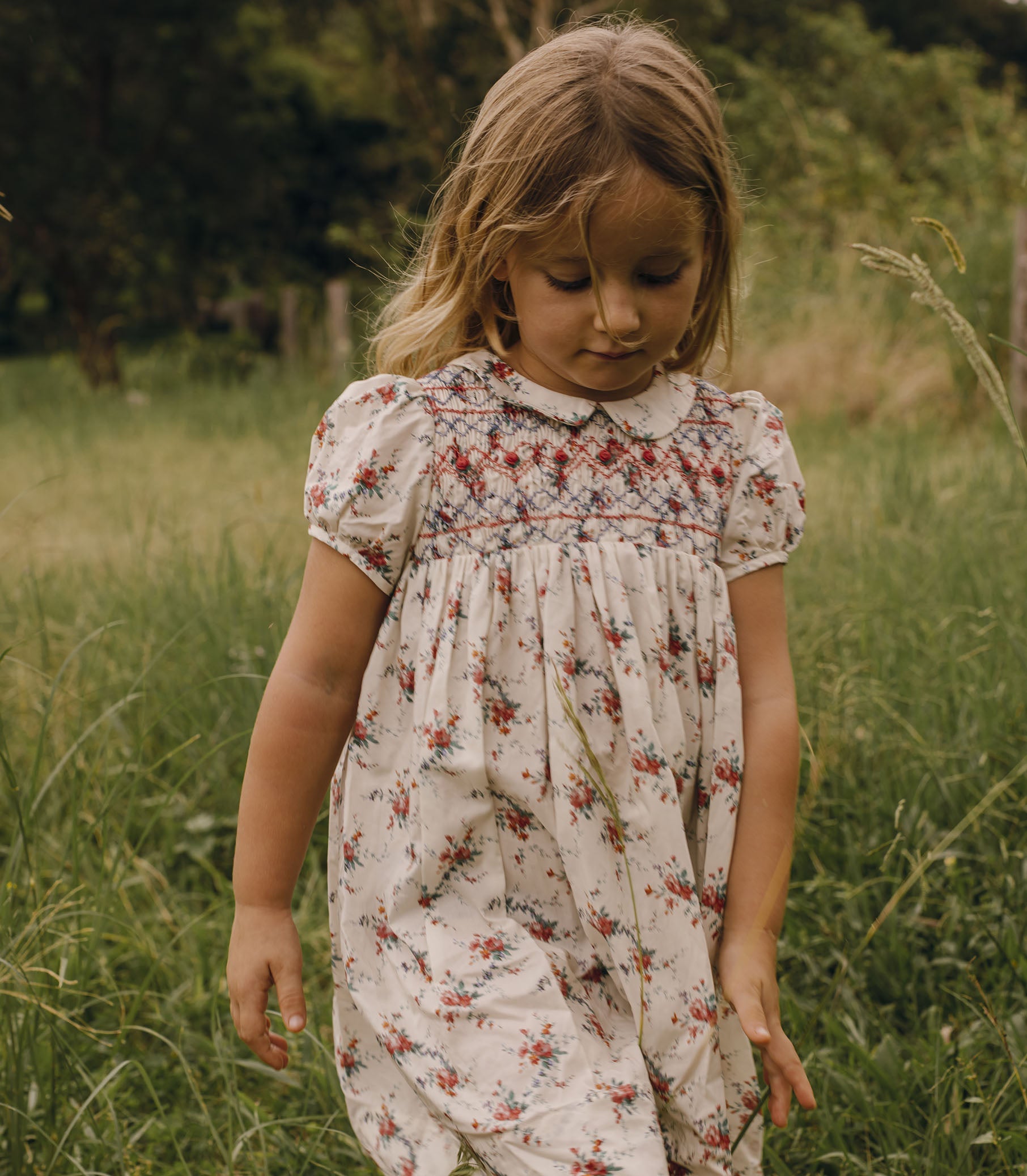 Crafted from a crisp cotton lawn and rendered in Alessia Rose, an archival Liberty Fabrics floral from the 1860s with delicate clusters of roses, tiny blossoms, and trailing foliage, the Rosette Dress features a Peter Pan collar, short puffed sleeves, and hand-embroidered rosettes and smocking at the bodice. A full skirt falls to just above the knee, while four buttons fasten at the back of the neck.