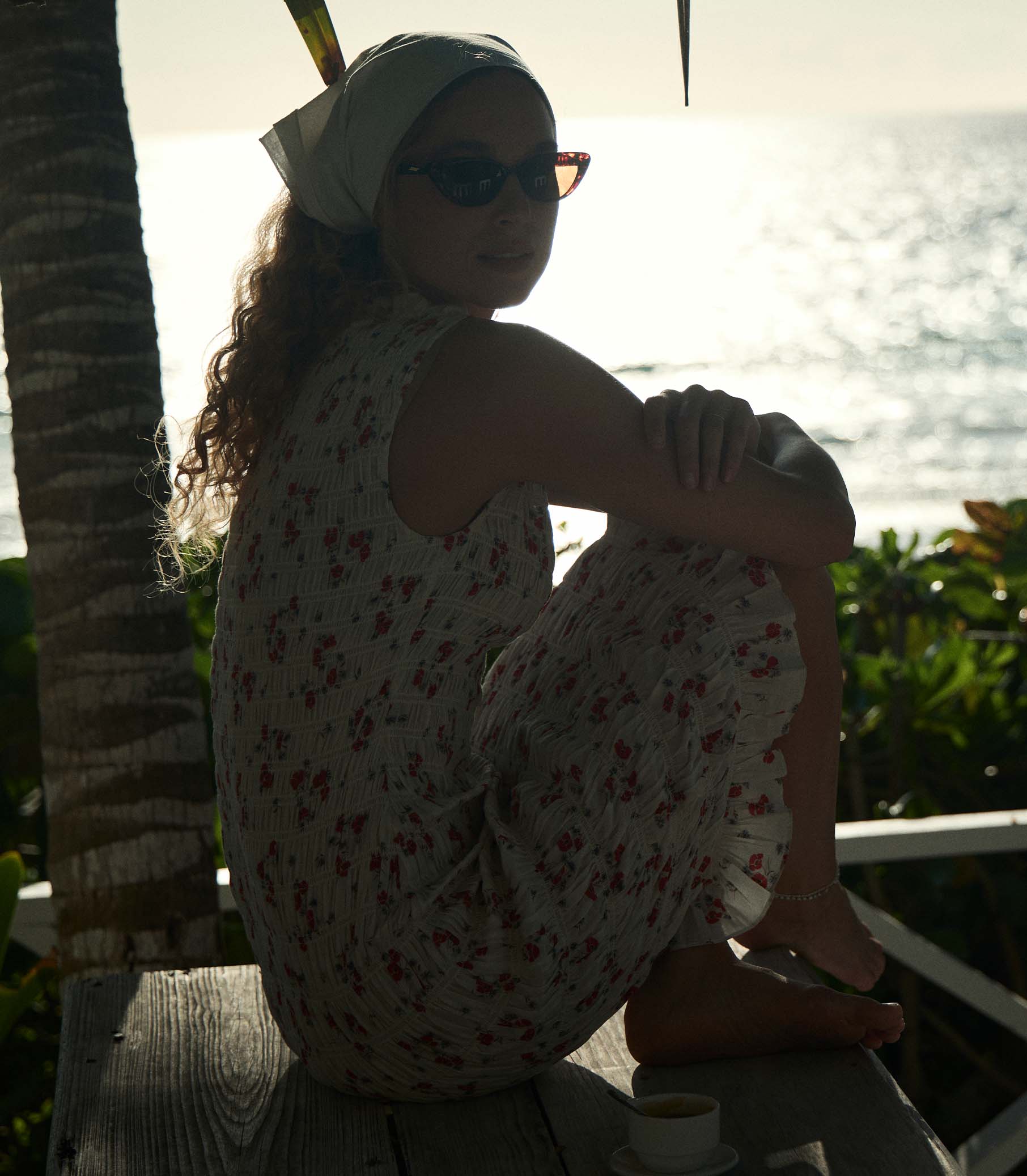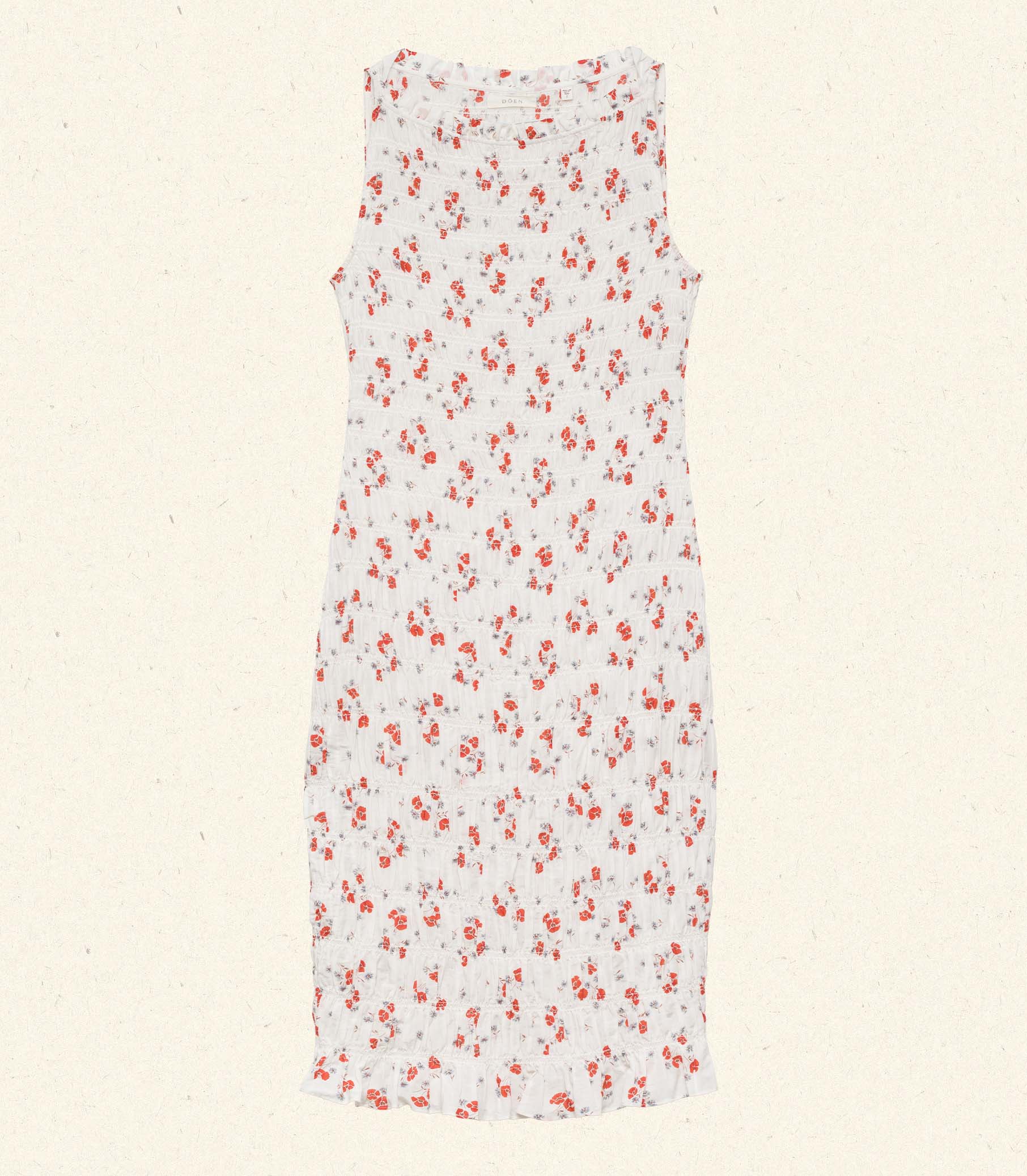 In a soft, lightweight blend of organic cotton and viscose, the Rosine Dress is an easy-wearing pullover style, adorned with our ‘30s-inspired Poppy Field print. It features allover elasticized smocking, a bateau neckline, and a fitted silhouette that finishes just above the knee.