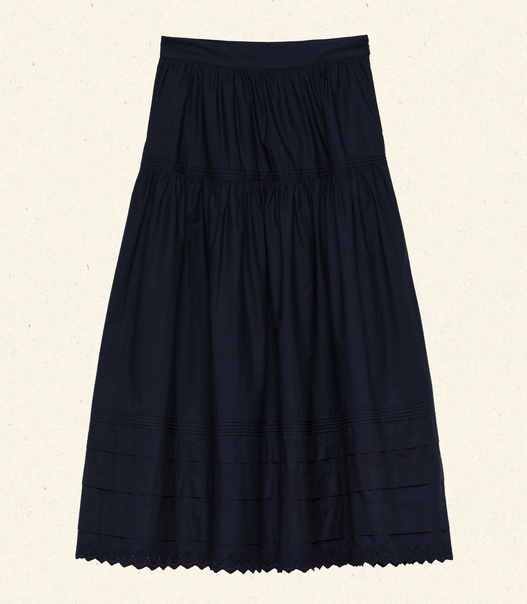 Inspired by an Edwardian-era trousseau and rendered in crisp organic cotton, the Sebastiane Skirt—a forever-favorite of our styling team—features a high waist, an A-line silhouette graced with horizontal tiered pintucks, and an ankle-grazing hemline trimmed with scallop eyelet embroidery for a touch of romance. An invisible side zipper with a hook-and-eye closure creates the perfect fit.