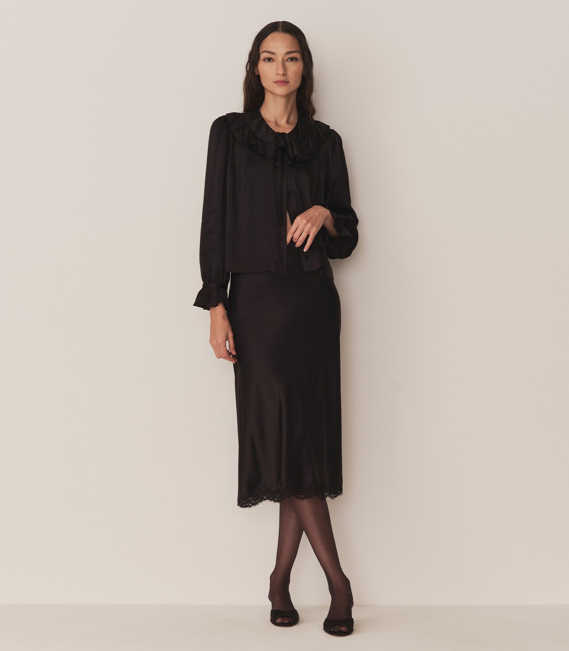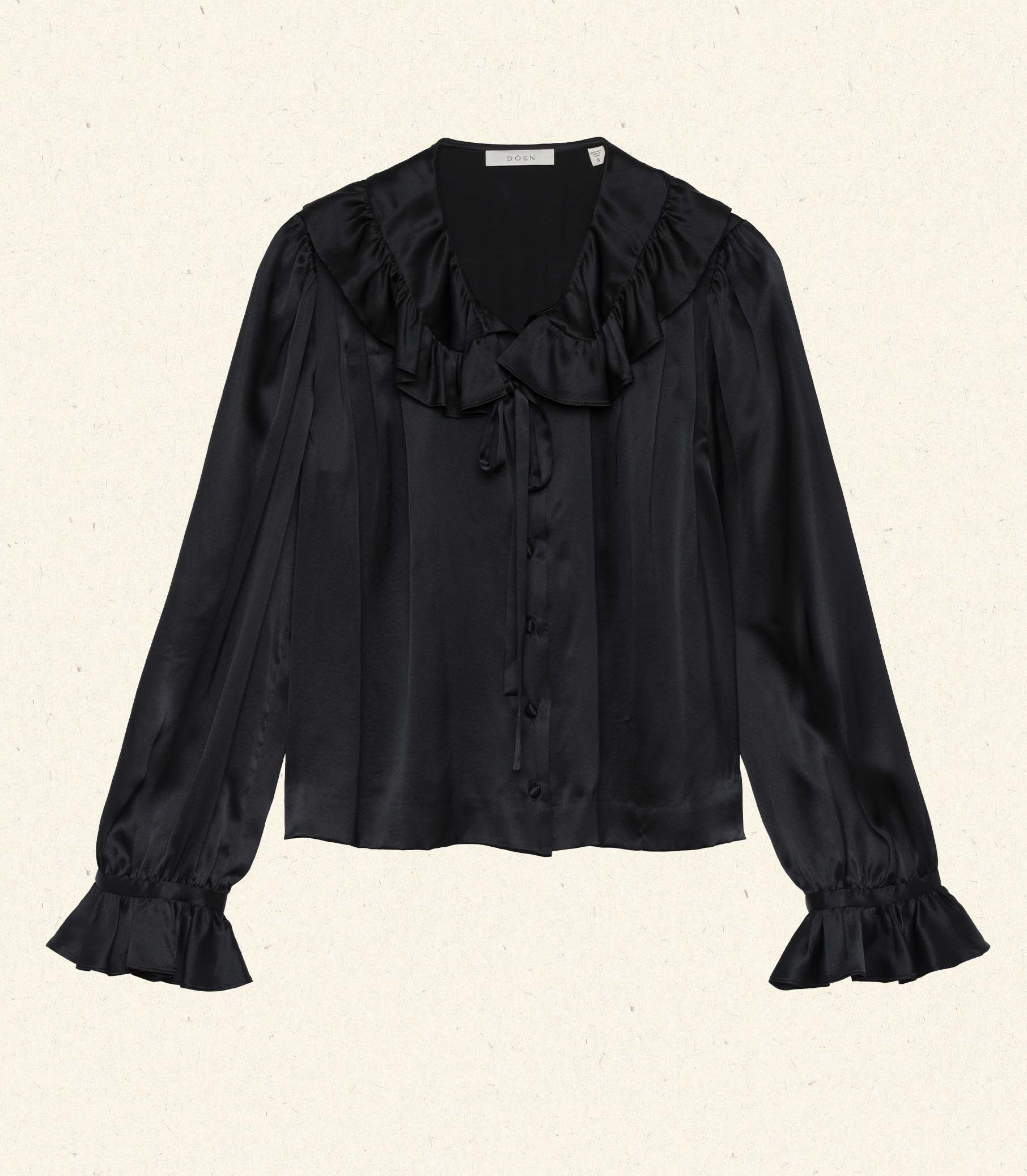 Our beloved Solange Top returns in time for Holiday gatherings. In buttery silk satin, the Solange features a breezy cut and a ruffle-trimmed Peter Pan collar with two delicate ties. Generous full-length sleeves finish with ruffles at the cuffs, while self-covered buttons extend down the front. Style with the Elowena Skirt for an effortless ensemble.