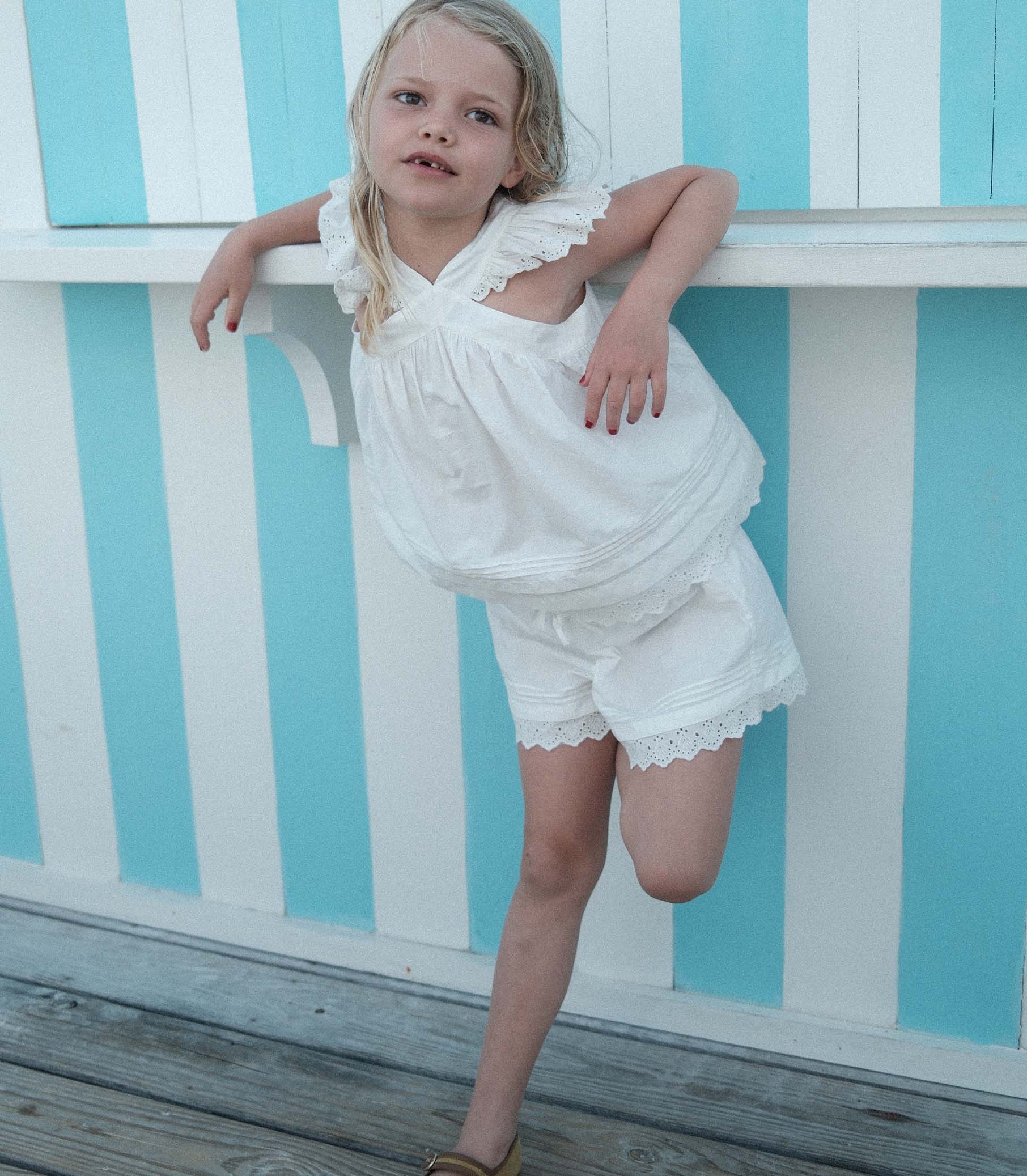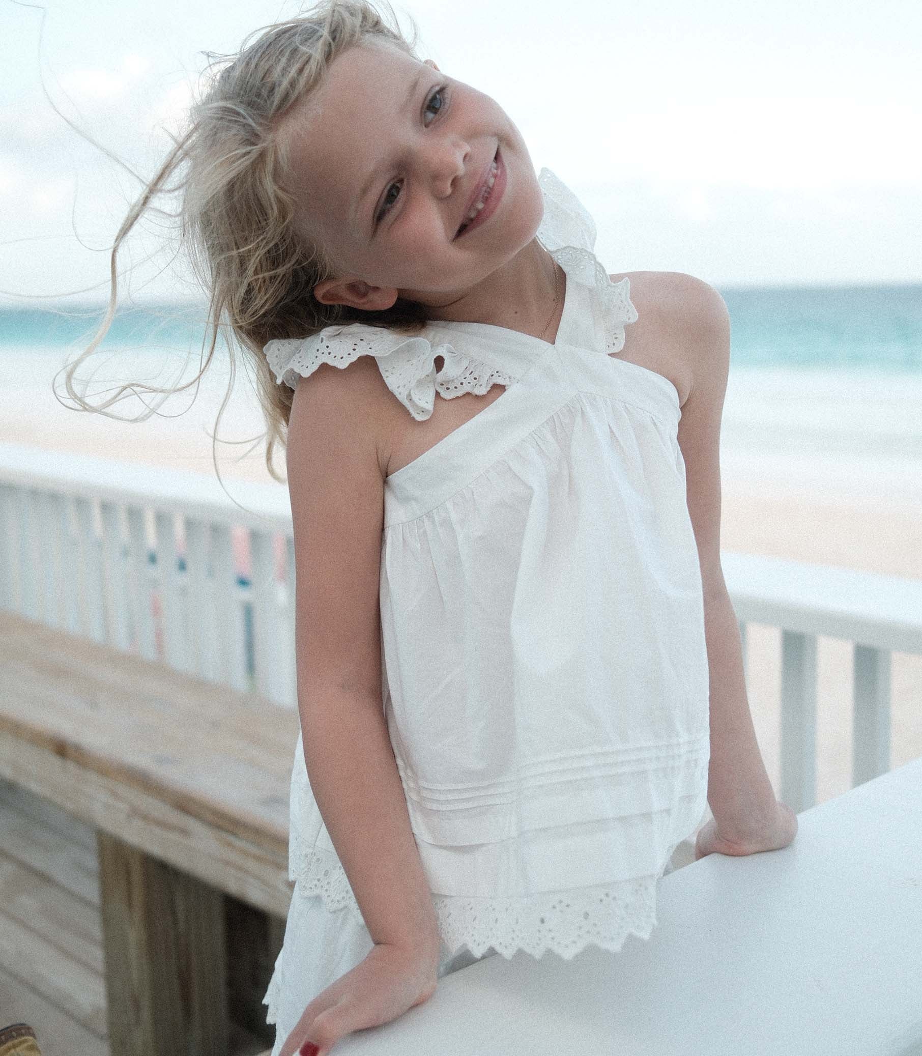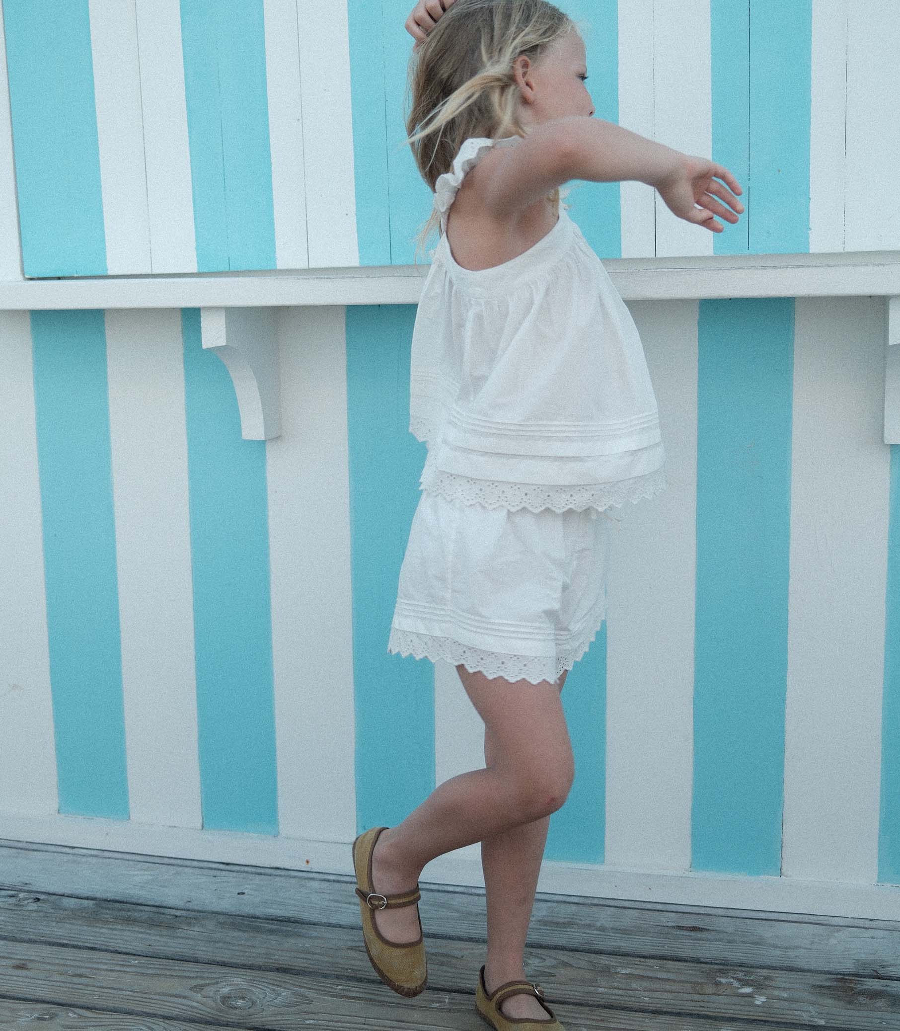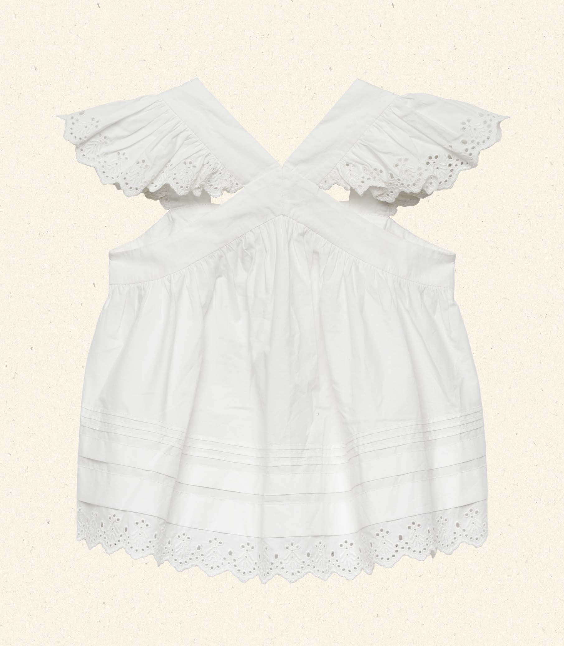 Crafted from crisp organic cotton poplin, the Soley Top features flutter sleeves and a breezy silhouette. Delicate pintucks and scallop eyelets grace the shoulder straps and hem, while two petite buttons fasten at the back neck.