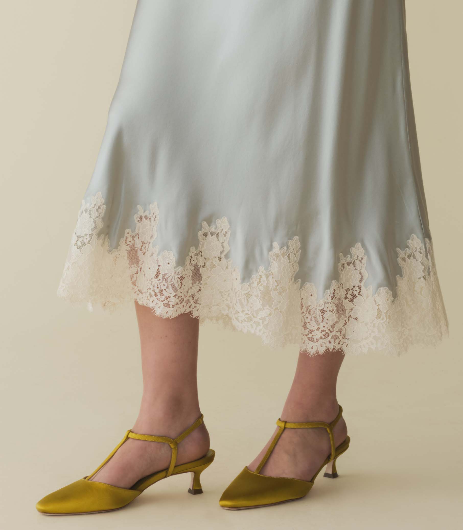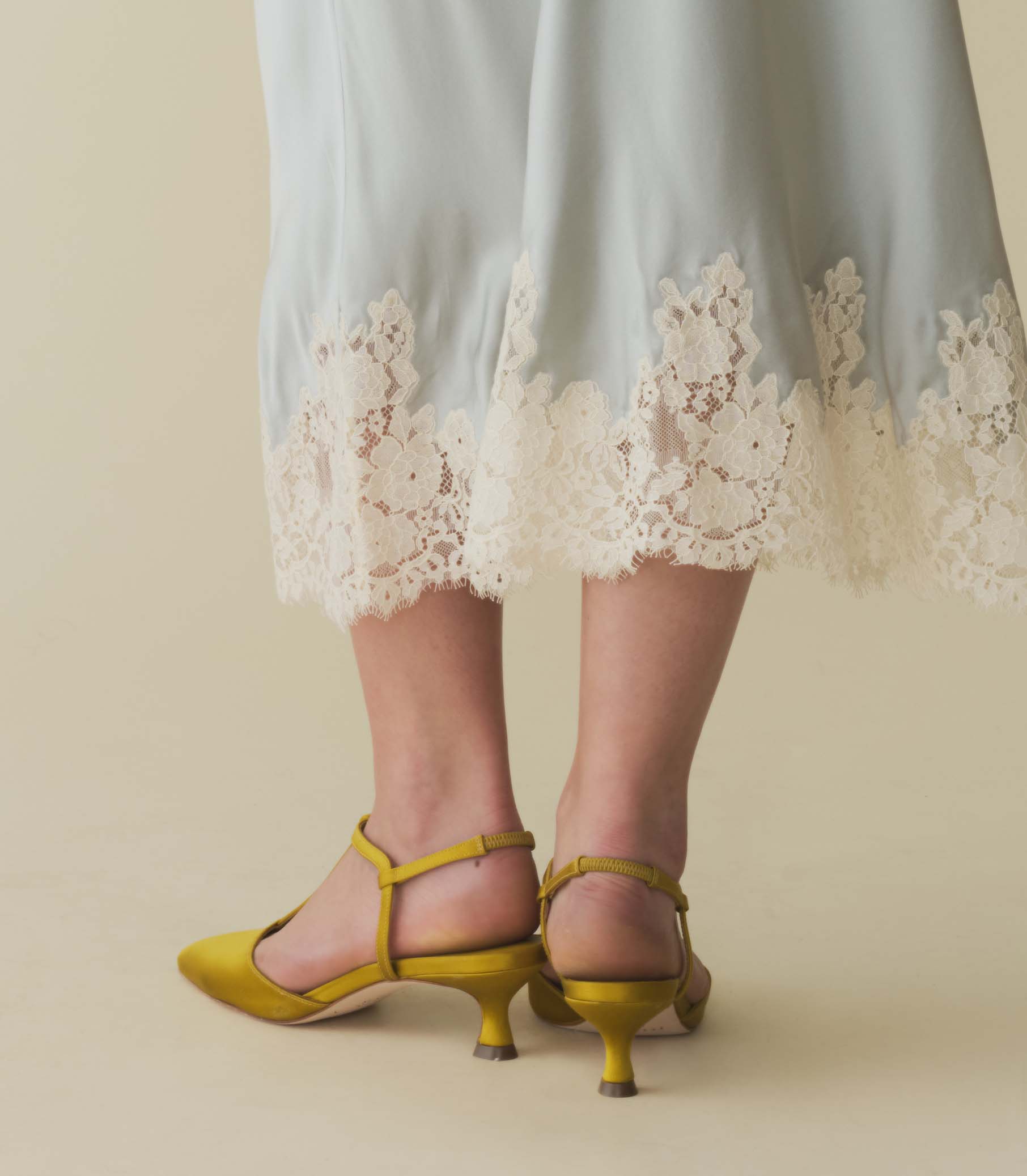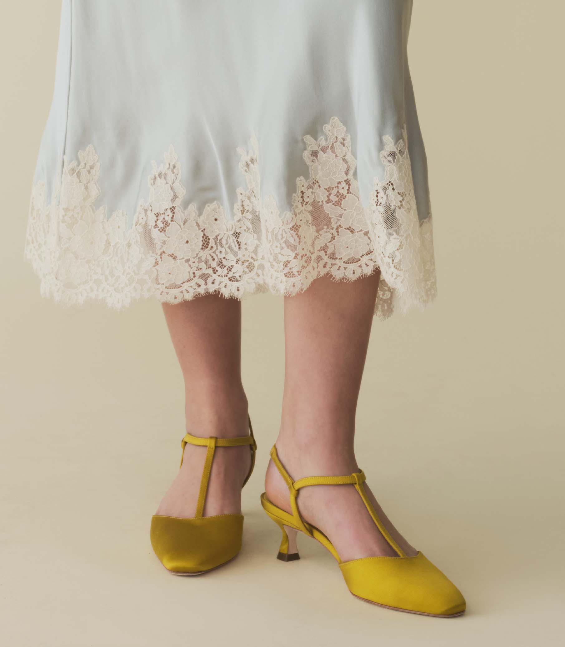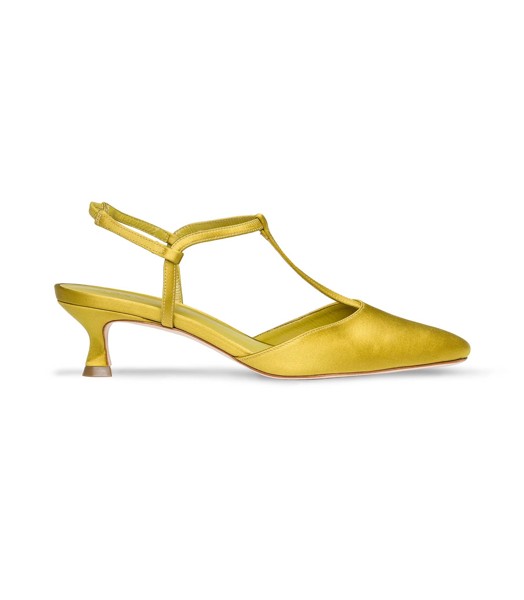 Handcrafted in Brazil from luminous satin, the Tabitha T-Strap Heel—a favorite of our co-founders, Margaret and Katherine—features a low cut, a squared-off almond toe, and a flared kitten heel. A slender ankle strap is reinforced with elastic at the back for comfort and stretch.