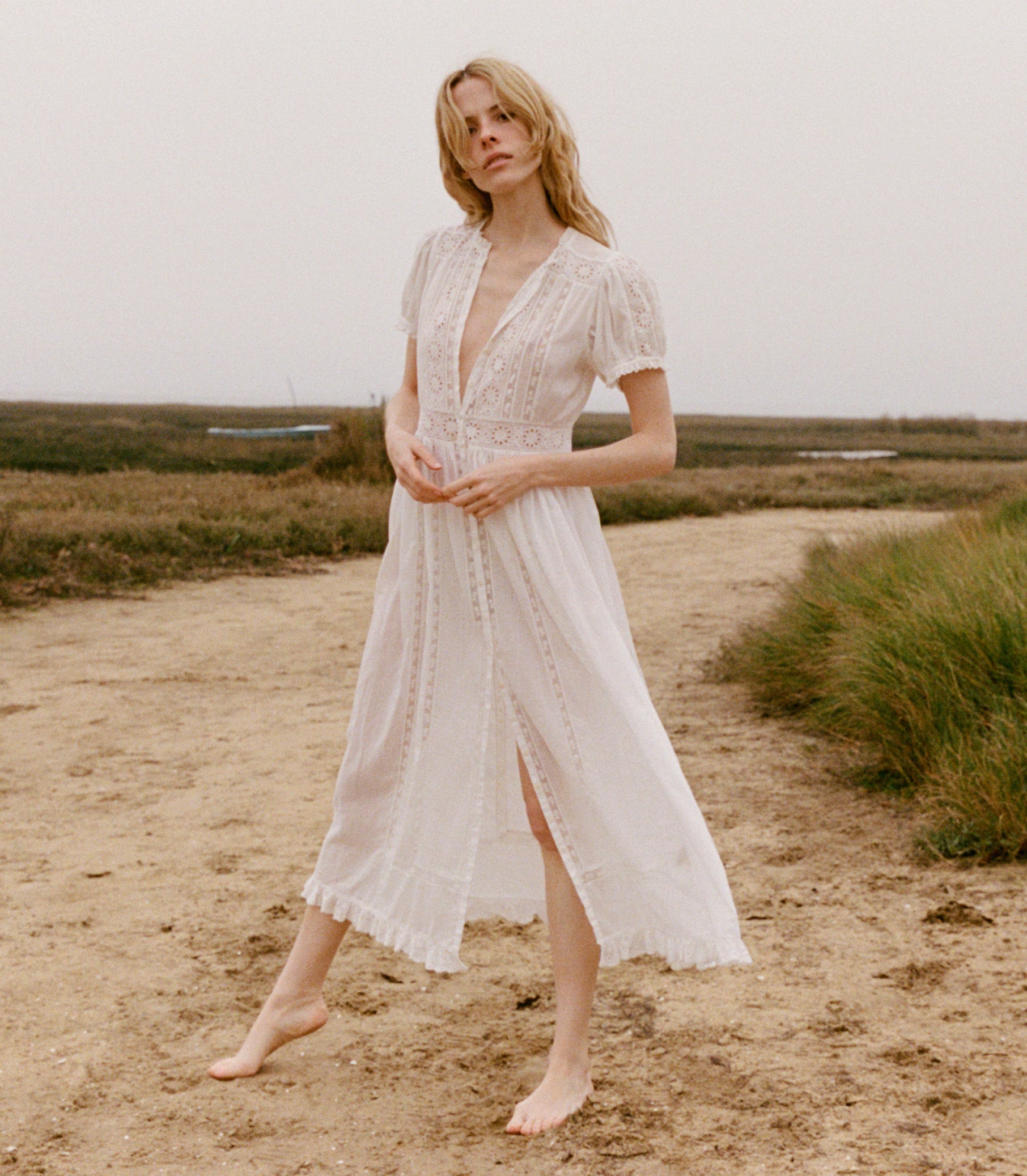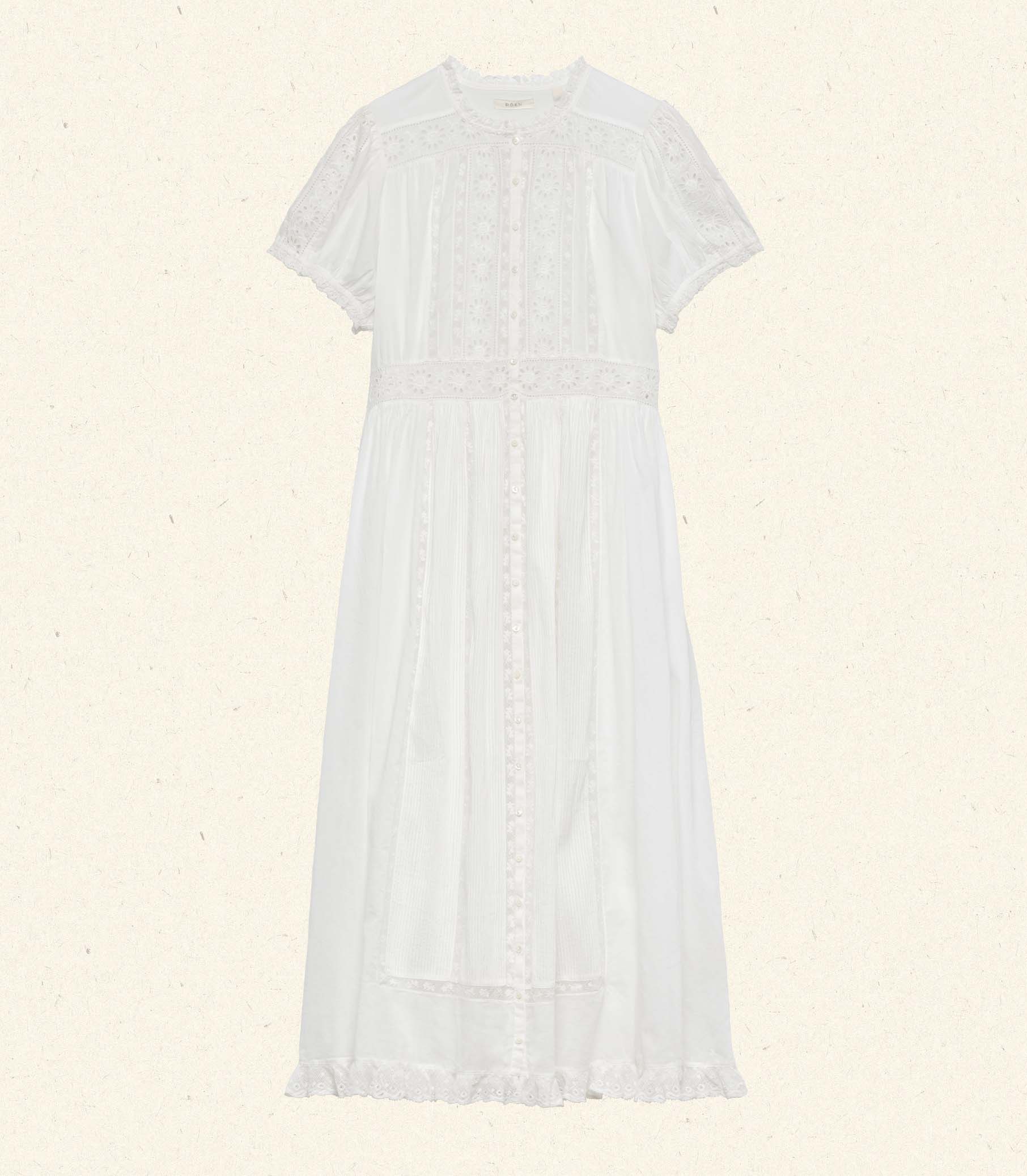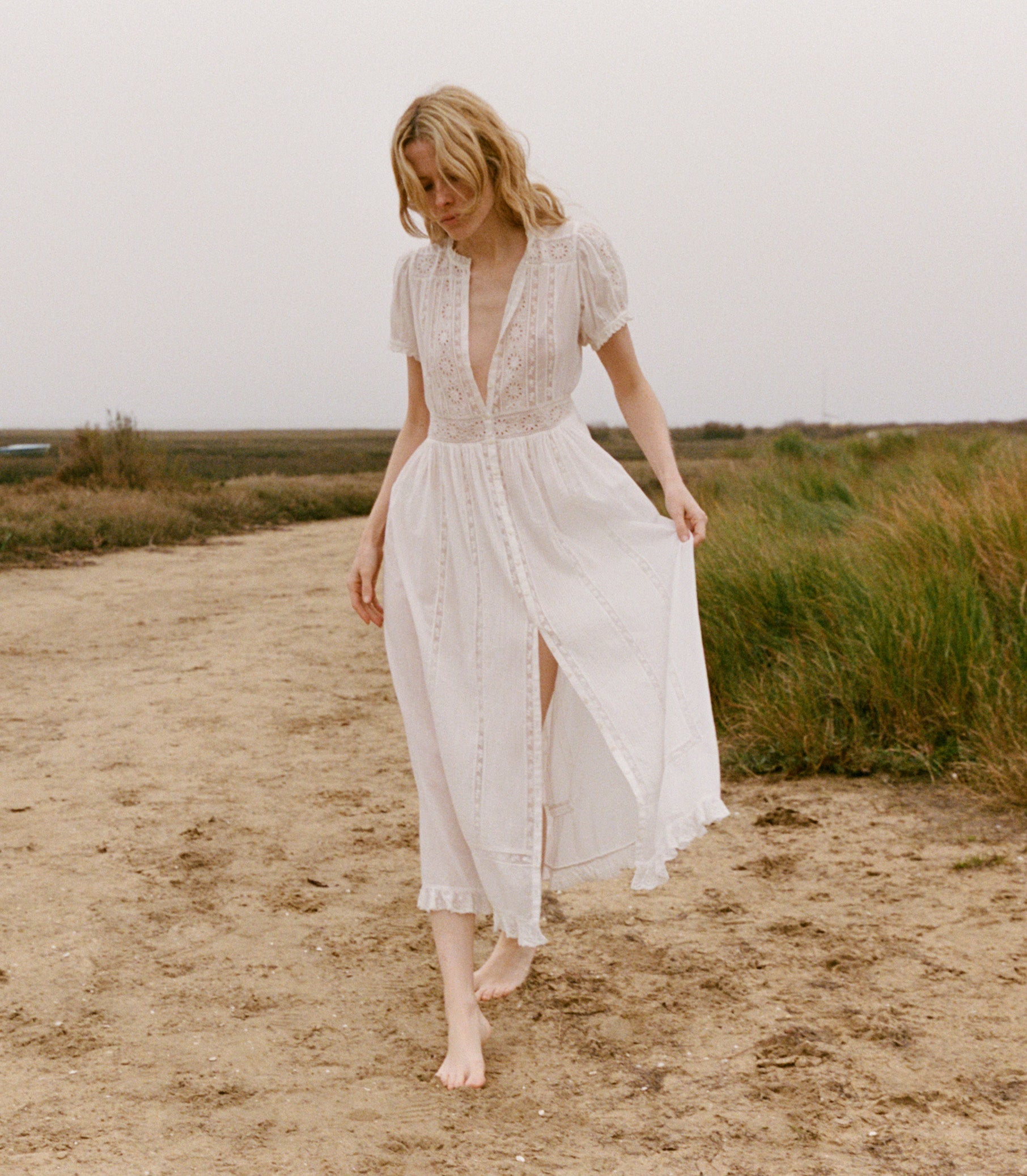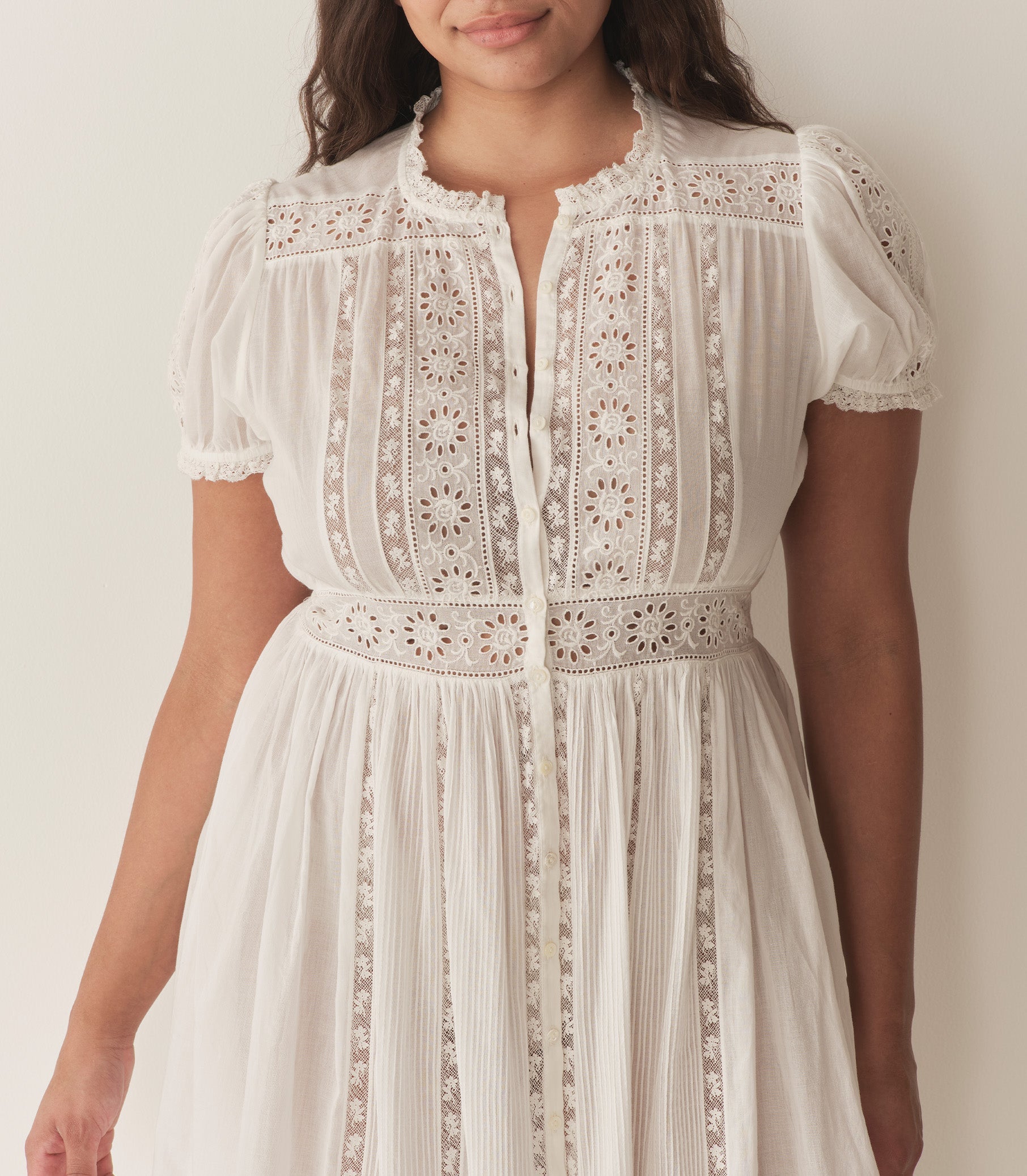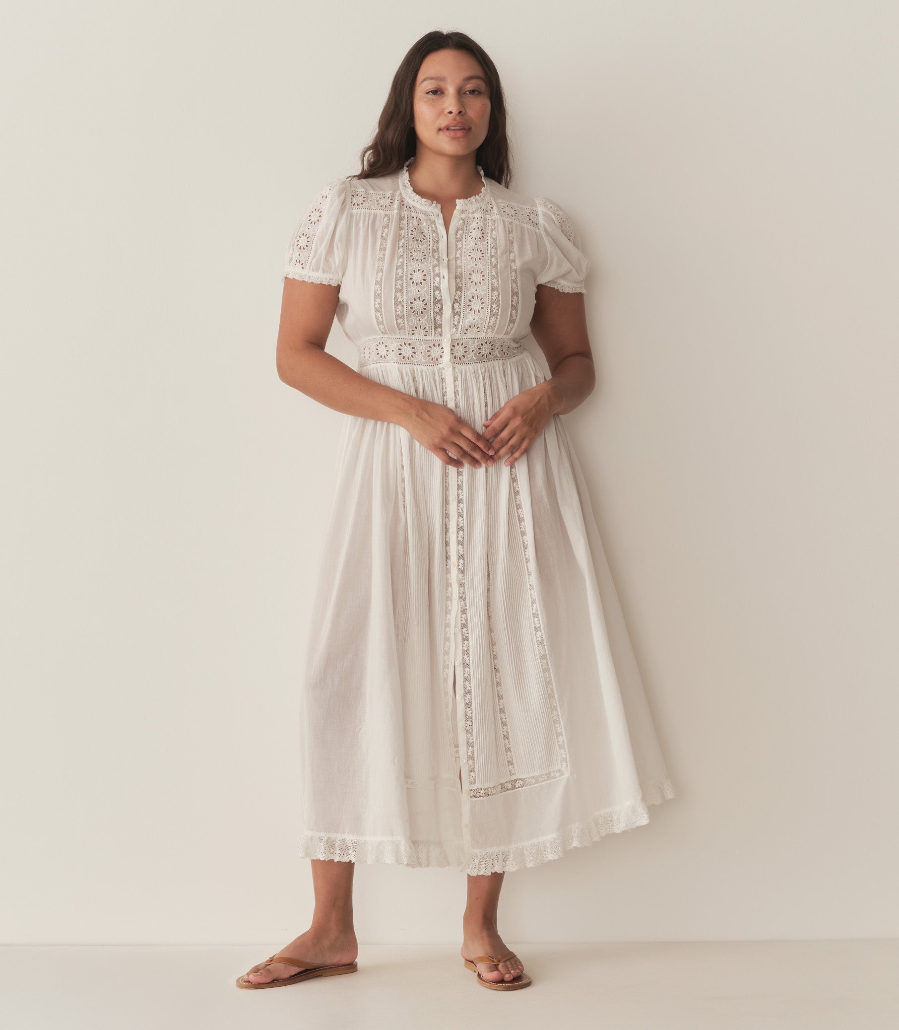 Crafted from the softest organic cotton voile, the Windsor Dress takes cues from our fan-favorite Leigh Top, featuring short puffed sleeves and allover alternating panels of inset lace, eyelet embroidery, and ladder trim. A line of starburst buttons run down the front, while a fitted waist gives way to an ankle-grazing skirt with a ruffle.