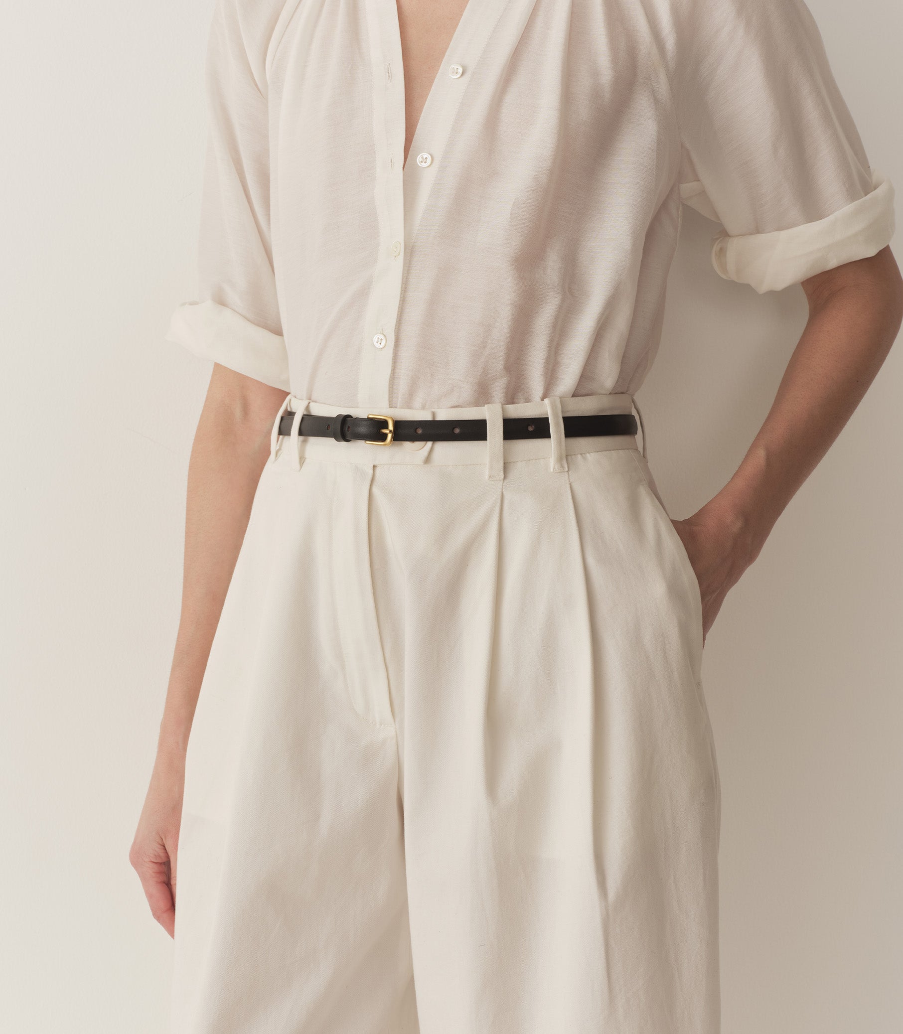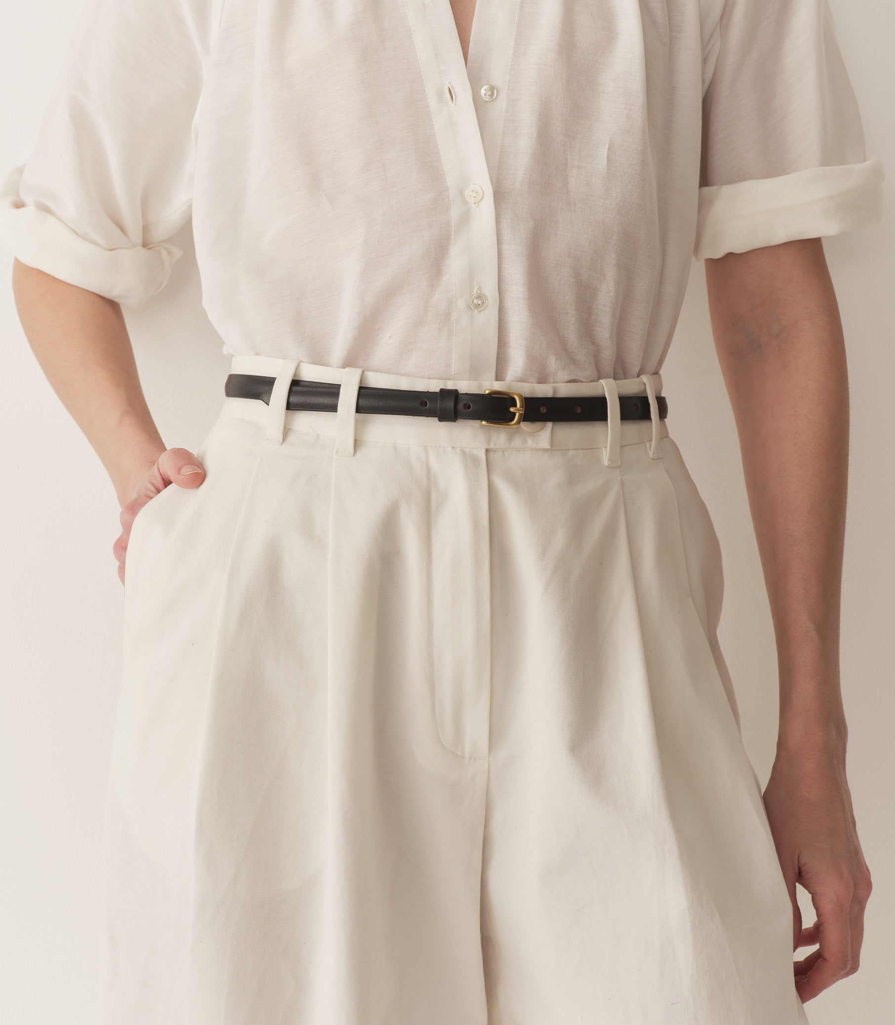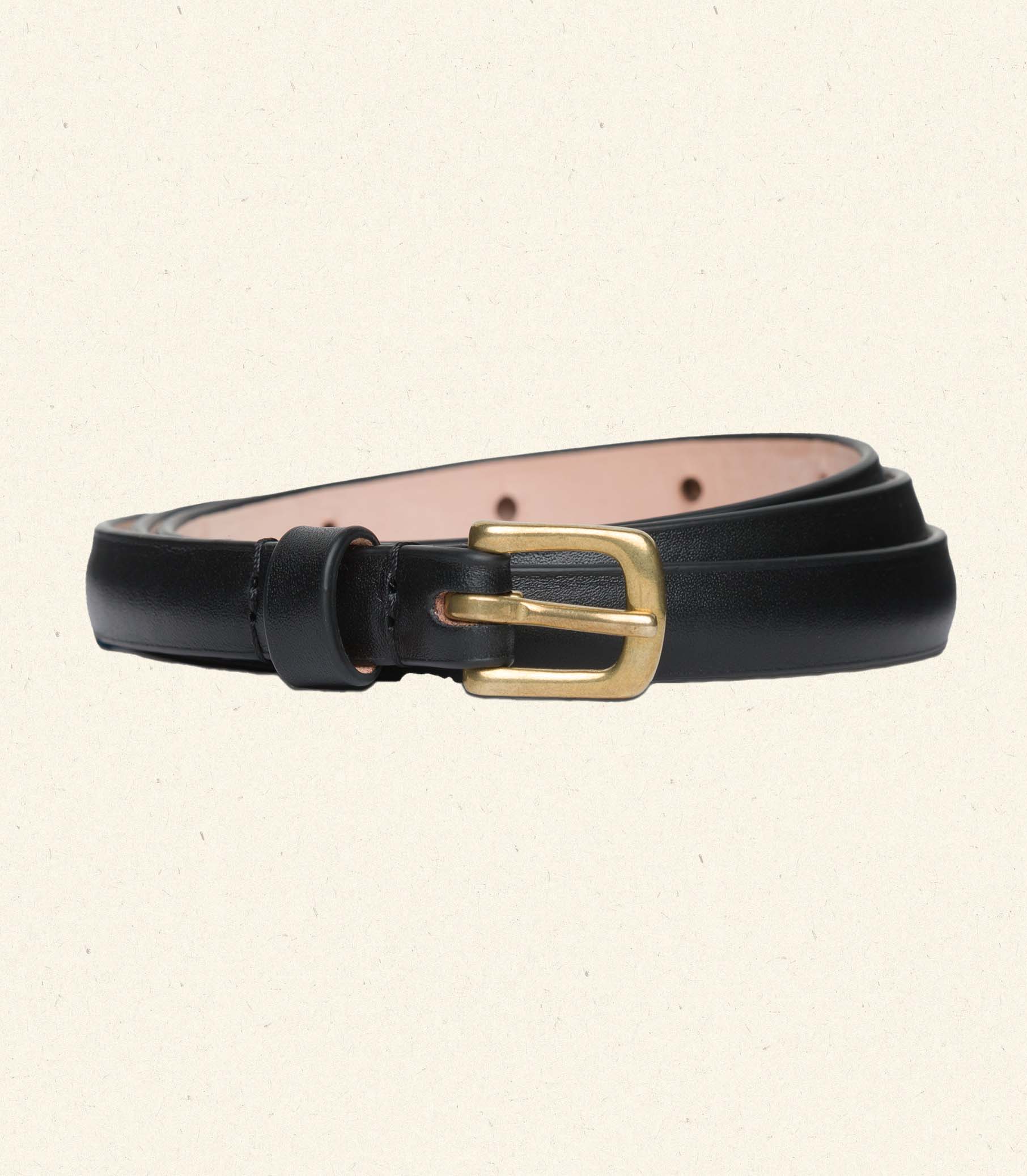 Handcrafted in Italy from luxe nappa leather from a certified responsible tannery, the Zaza Belt is a classic skinny belt with a brass demi buckle that can be worn at the high waist or on the hips.